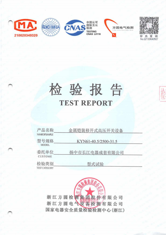 KYN61-40.5金屬鎧裝移開式高壓開關設備檢驗報告