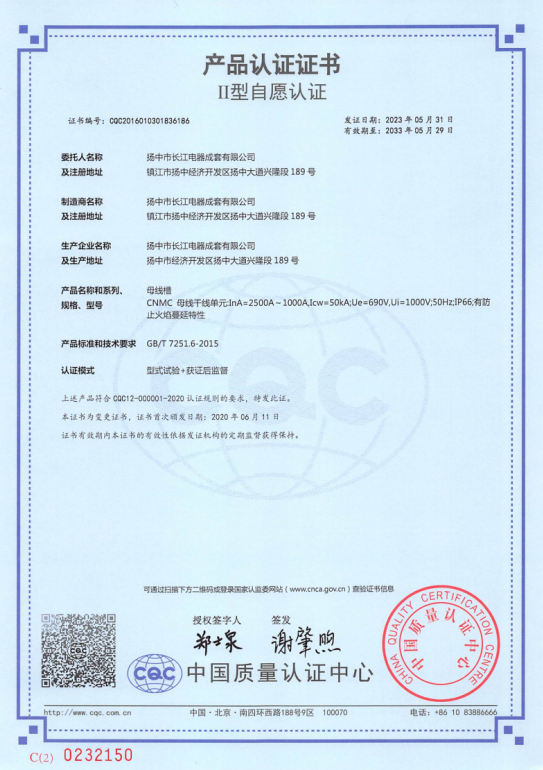 母線槽CNMC-2500A-1000A-產(chǎn)品認證證書