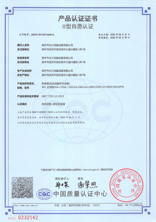 配電箱(低壓成套開關設備)XM-250A-20A-產品認證證書